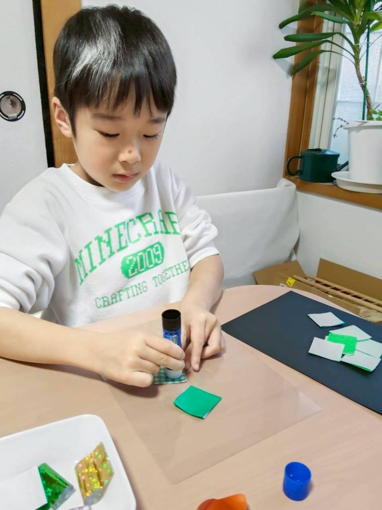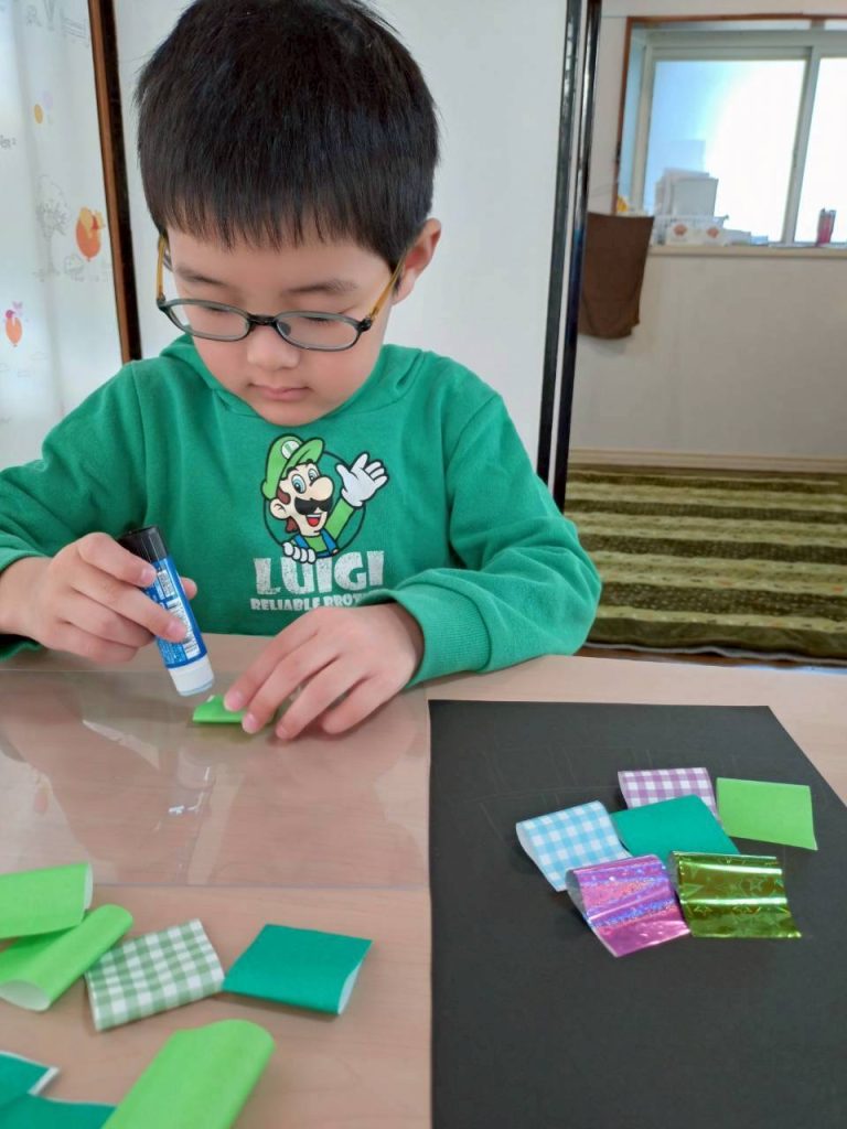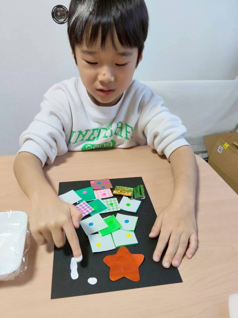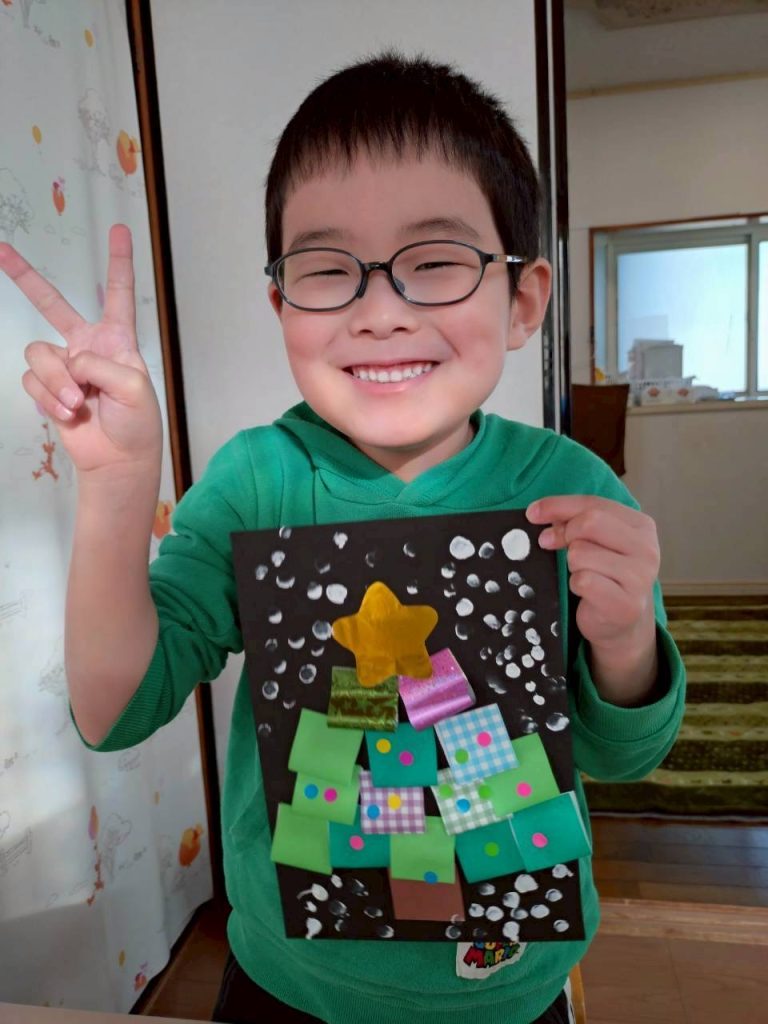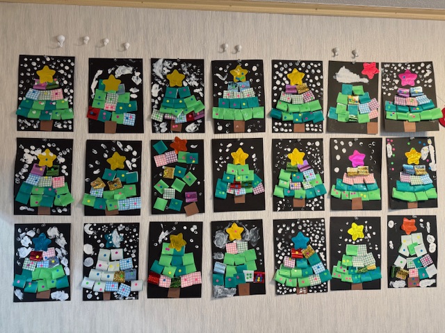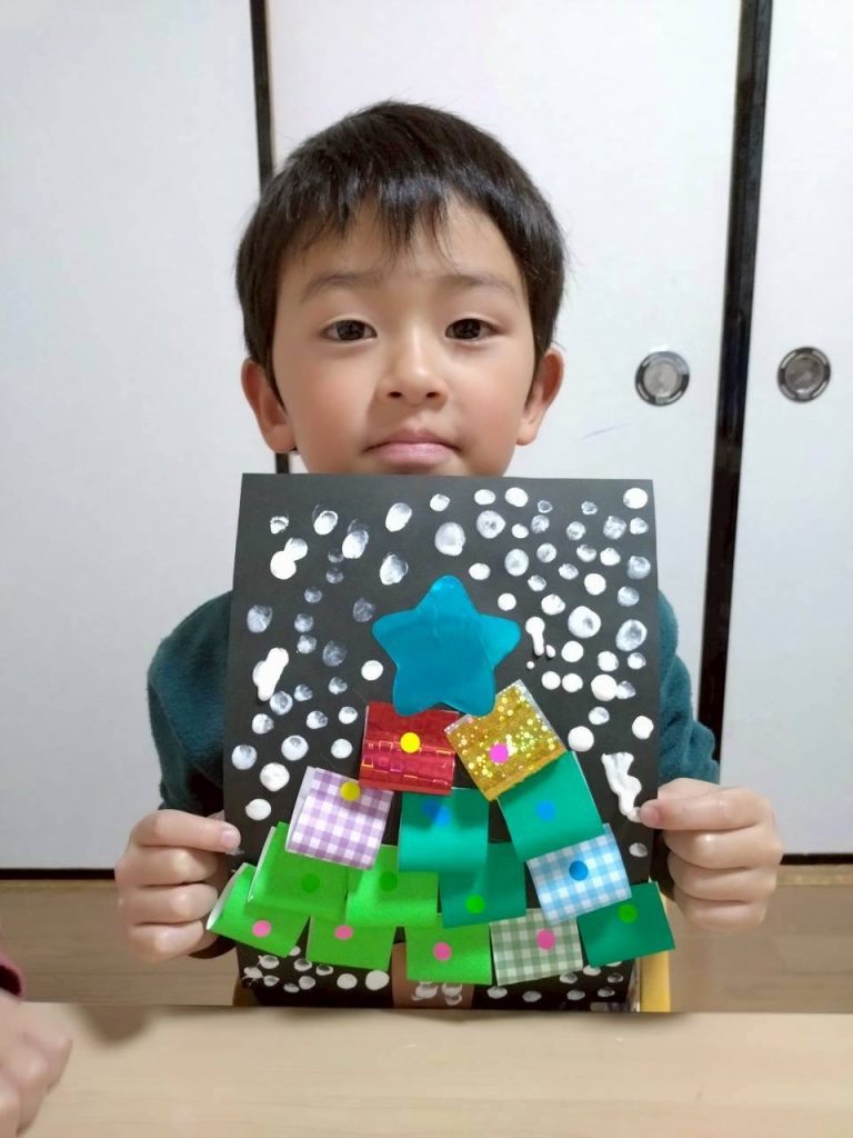 12月の制作は、クリスマスツリーを作りました🌲✨短冊の折り紙を輪っかにして糊付けした後に、画用紙に貼りました。輪っかを作る時に「雪にしたい!」と言いながら、折り紙を裏返しにして雪を表現している子もいました。シールで飾りを付けて最後は指スタンプで周りに雪を降らせました☃💕指で絵の具を触る感触を気に入る子が多く、押したり伸ばしたりして楽しむ様子が見られました。「ママに見せたい!」「いつ持って帰れる?」と心待ちにしている子どもたちが可愛いです♡素敵なクリスマスになりますように✨