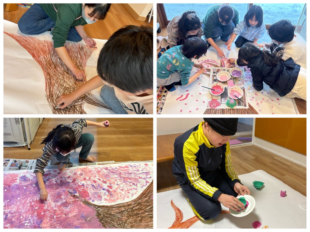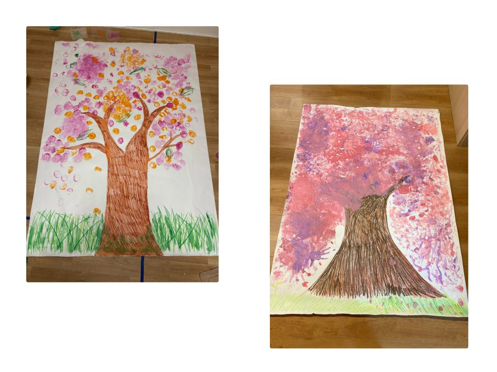 大きい紙に皆で木の幹を描いて、手のひらや指先を使って絵の具の感触を楽しんだり、道具も使って…どんな桜の木ができるかなぁー??🤔💭